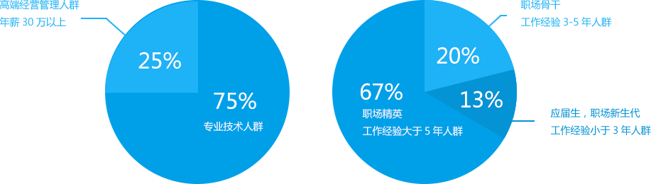 英才網(wǎng)聯(lián)的專(zhuān)業(yè)人才庫(kù)中專(zhuān)業(yè)技術(shù)人群占比頗高,可見(jiàn)專(zhuān)業(yè)技術(shù)人群非常雄厚、充足。同時(shí),對(duì)于企業(yè)客戶(hù)來(lái)講,應(yīng)屆生、職場(chǎng)新生代、職場(chǎng)骨干、職場(chǎng)精英等人群可謂應(yīng)有盡有,足夠滿(mǎn)足企業(yè)的日常招聘、專(zhuān)業(yè)崗位的招聘等需求。